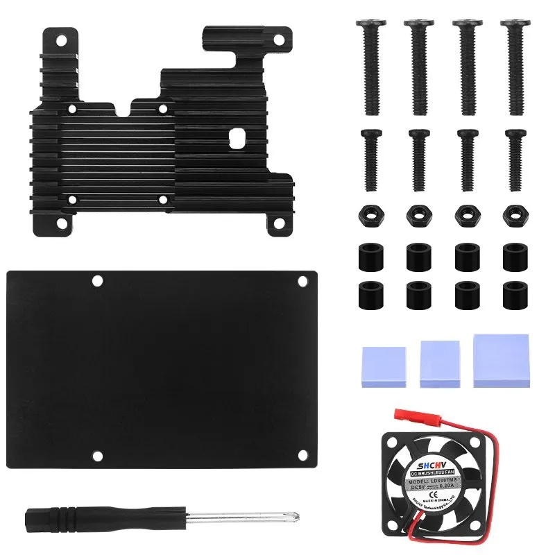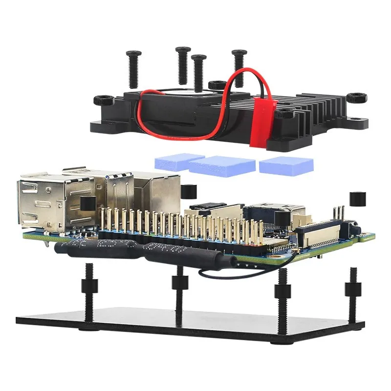 Комплектация включает в себя не только сам корпус Orange Pi 3B, но и все необходимые аксессуары для его монтажа: термопрокладки для лучшей теплопередачи, основной радиатор охлаждения для эффективного отвода тепла, качественный вентилятор, обеспечивающий дополнительный воздушный поток, отвертку и набор крепежных элементов для легкой и быстрой сборки.