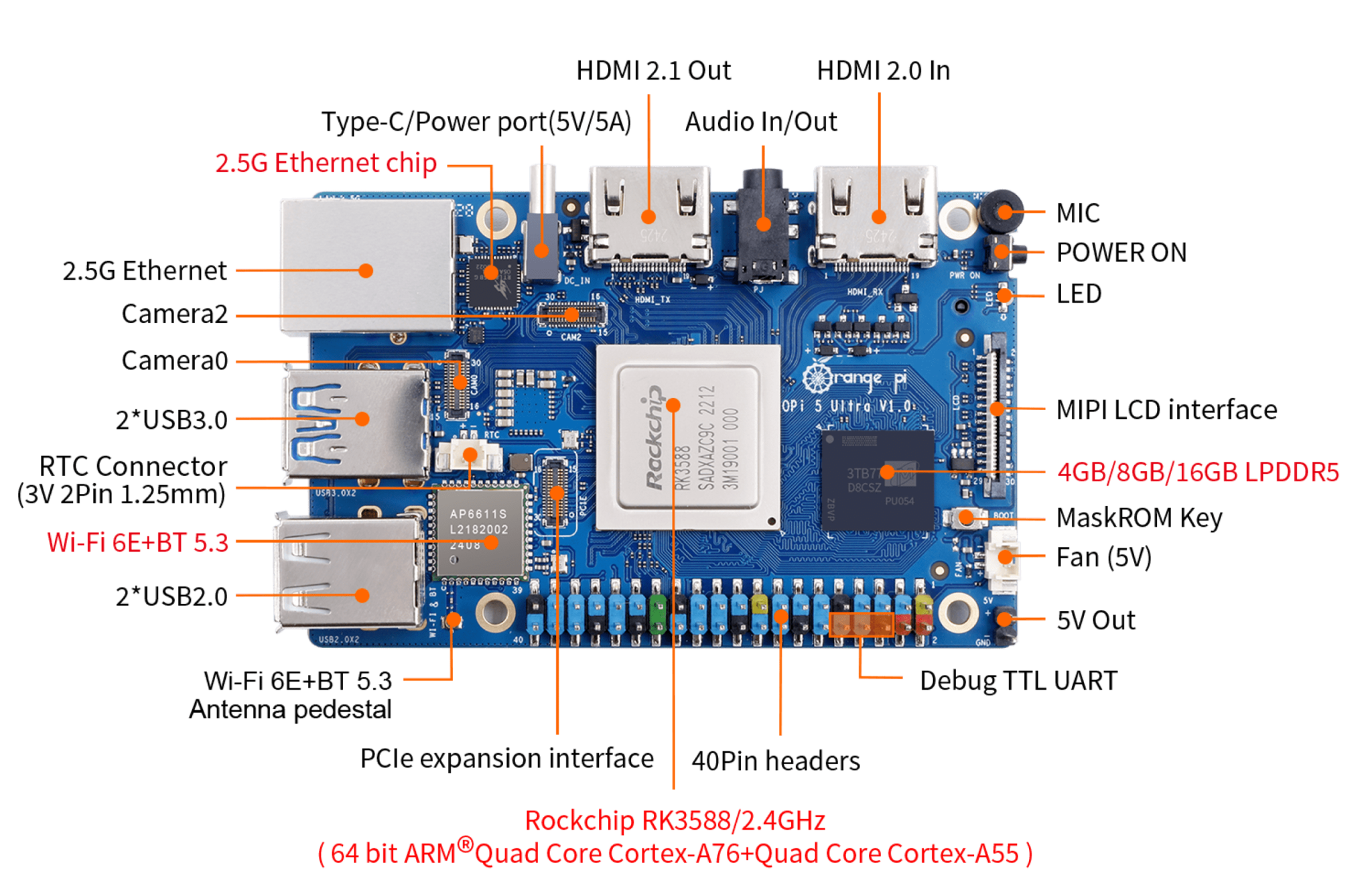 Orange Pi 5 Ultra с 8 ГБ оперативной памяти — это мощный одноплатный компьютер, идеально подходящий для разработки, мультимедийных приложений и серверных решений. Оснащенный 8-ядерным процессором и поддержкой 4K видео, он обеспечивает высокую производительность и множество интерфейсов для подключения периферии. С легкостью справляется с многозадачностью и подходит для различных проектов, включая IoT и образовательные цели. Компактный и универсальный, Orange Pi 5 Ultra является отличным выбором для энтузиастов и разработчиков.