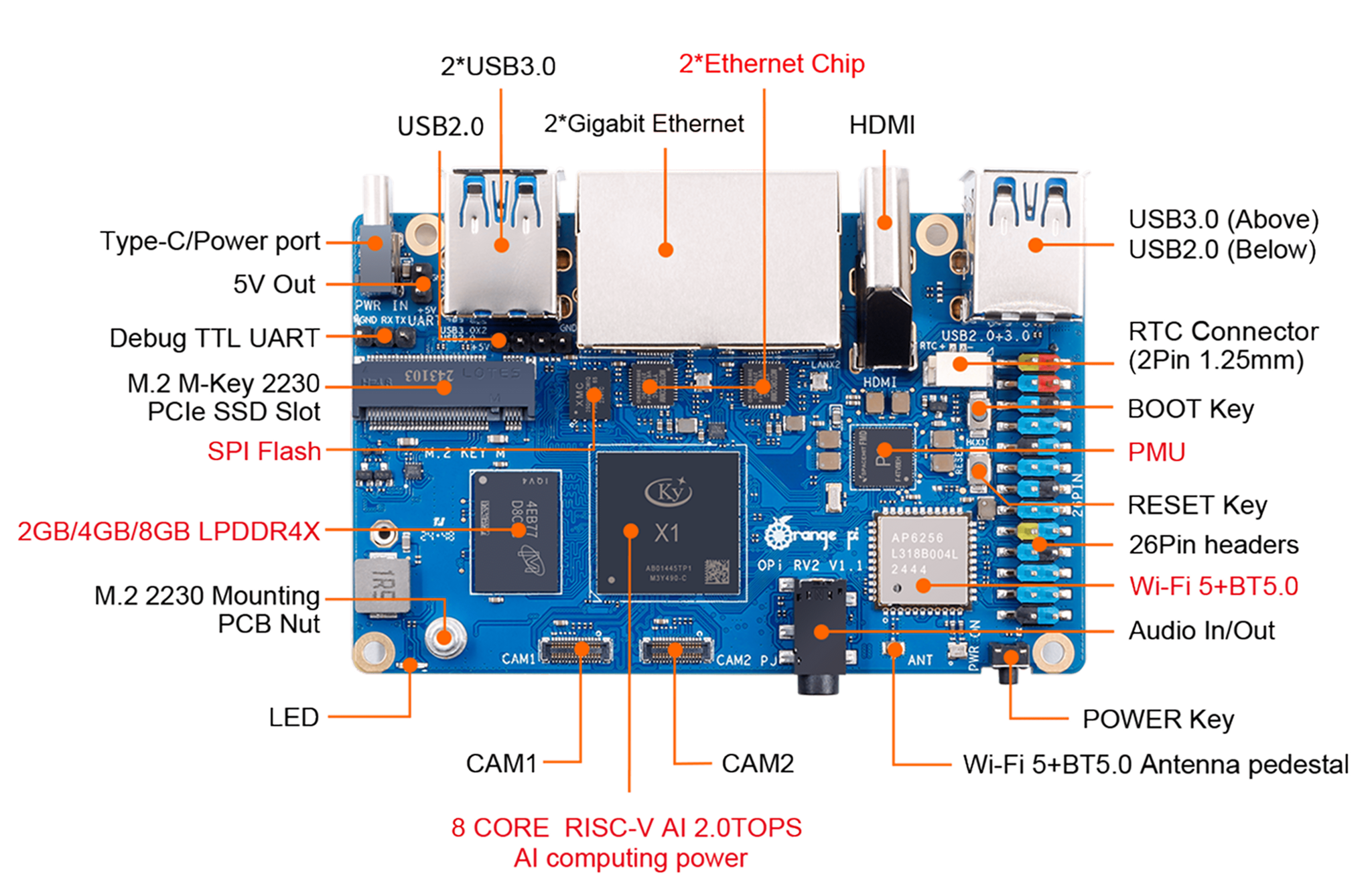 Комплектация: Плата Orange Pi RV2, документация (блок питания и карта памяти опциональны).