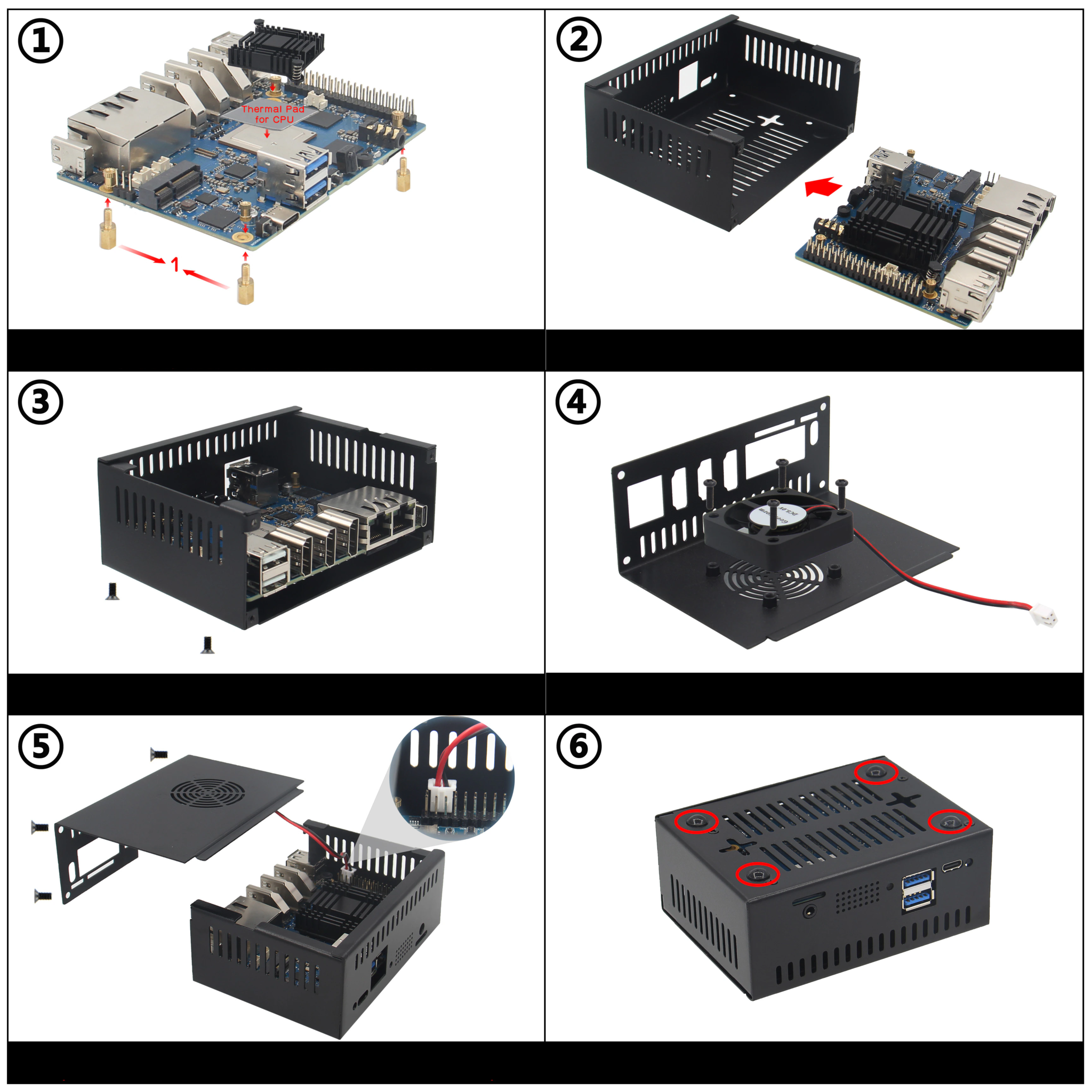 В комплекте идет все необходимое для сборки: Корпус, термопрокладки, основной радиатор охлаждения, отвертка, вентилятор, набор крепежа